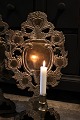 A pair of decorative French 19th-century black-painted wooden stands finely decorated with brass ornaments with remnants of old varnishing. The wooden decorations originate from a church where they stood on the altar as a background for a candle and reflected the light.