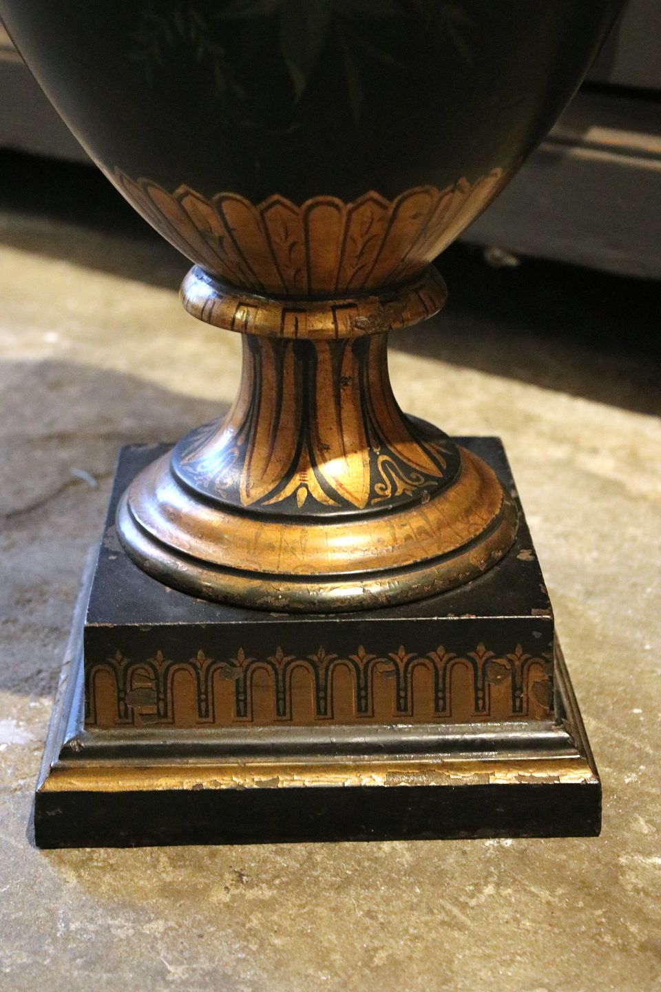 LARGE decorative 19th century iron vase with hand-painted floral motif and gold decorations.