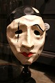 Dekorativ , gammel klovnemaske i bemalet papmache monteret på gammel sortmalet træ fod. H: 44cm. B: 16cm. Emne nummer: Klovnemaske