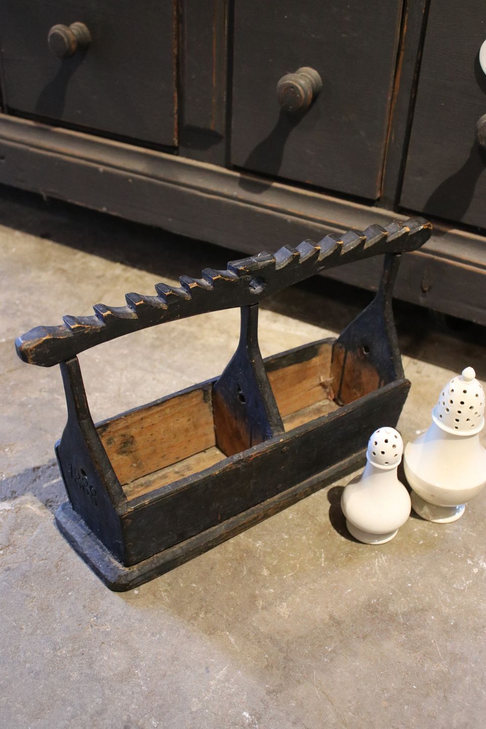 Old 19th century Swedish storage box with original color and handle for storing small items. Dated 1888 and measures: H: 22.5cm. L: 36cm. W: 10.5cm.