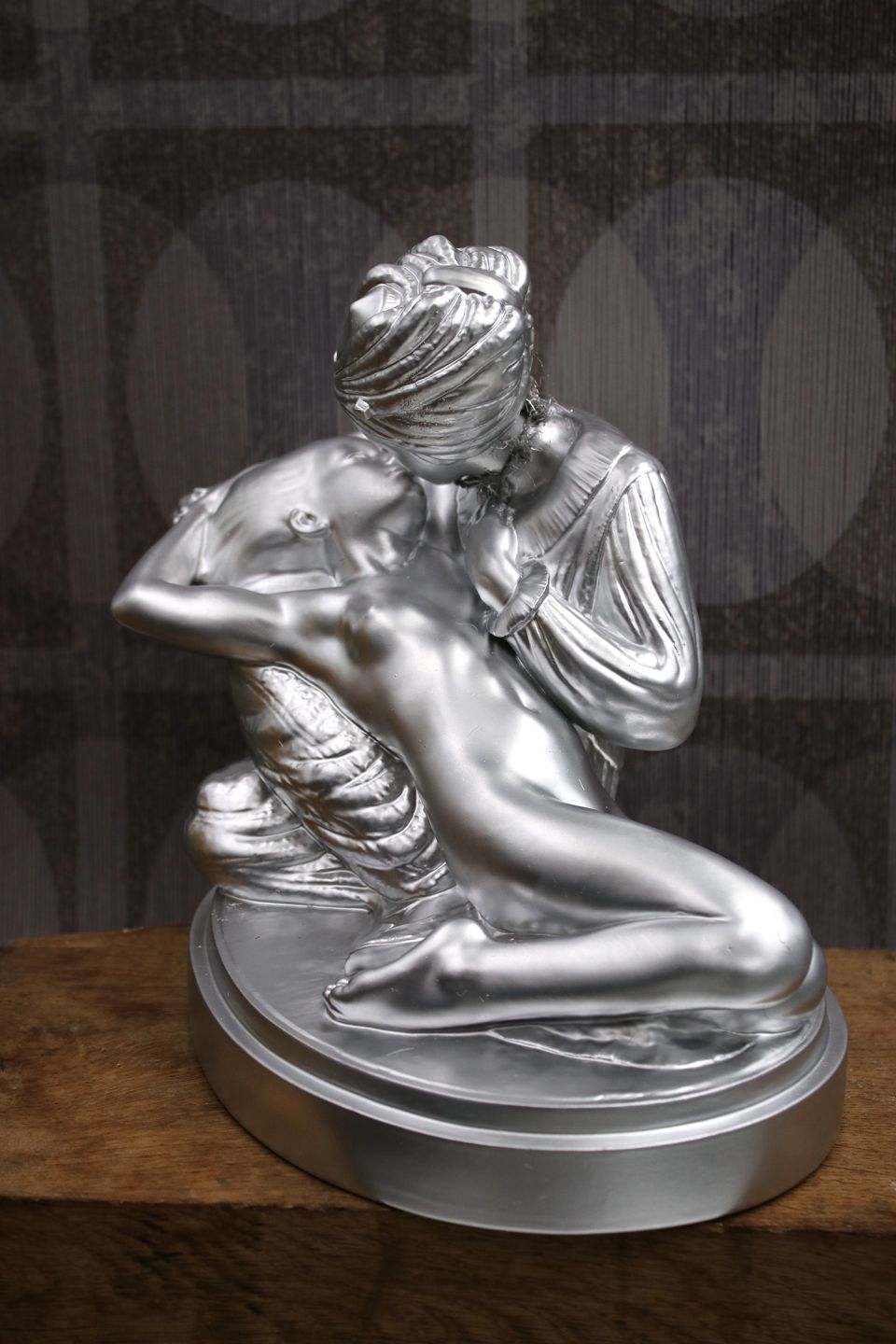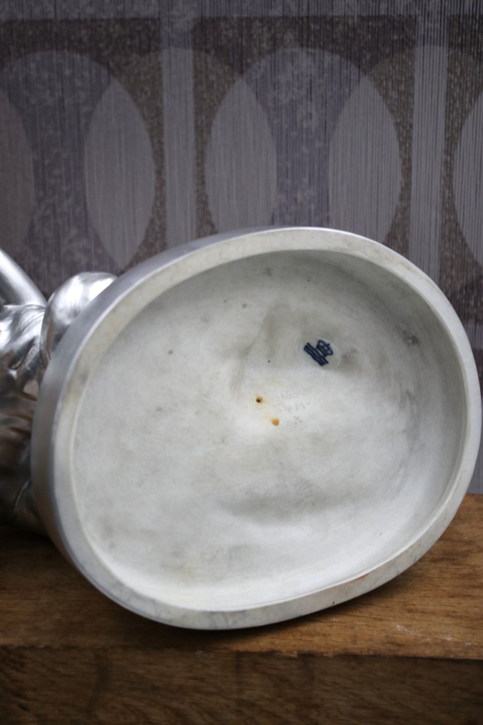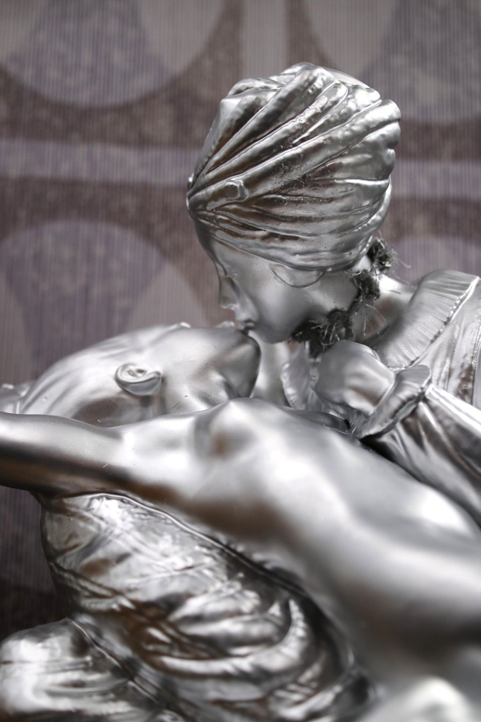 The head of the man has been glued to the neck and the figure has then been spray painted in silver chrome color.