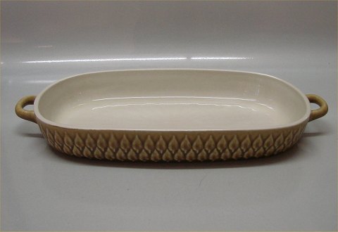 Beskrivelse: Bing & Grøndahl B&G Relief 401 Oval skål med hanke 36 cm Quistgaard Nissen Kronjyden stentøjsstel. I fin og hel stand. Bing & Groendahl. Stemplet Kronjyden eller Bing & Grondahl Copenhagen Stoneware: Bladformet mønster i releif på gult stentøj af Quistgaard for Kronjyden, Nissen.