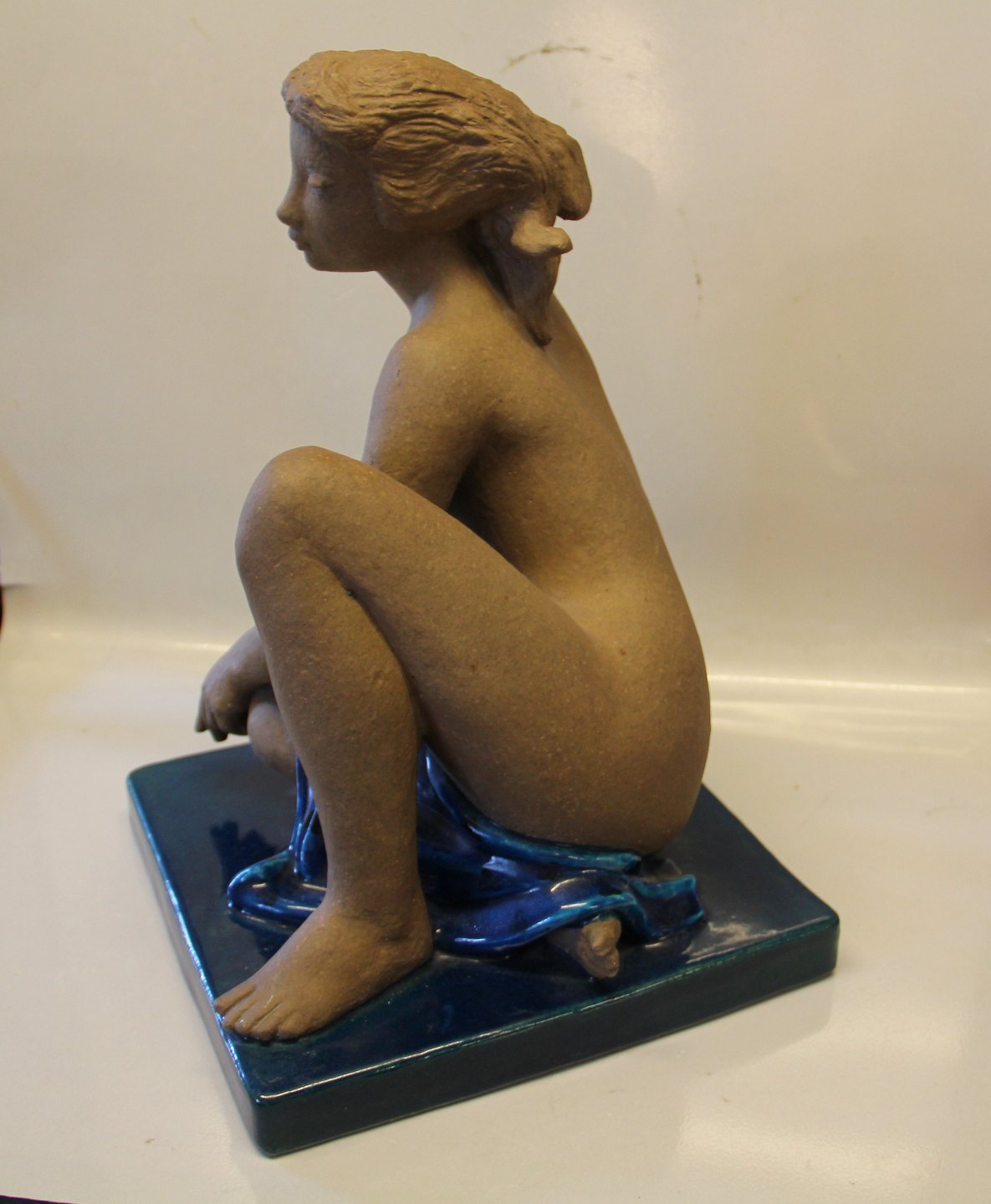 Beskrivelse: Royal Copenhagen stentøj 21845 Kgl. Siddende kvinde H: 36 cm, JH, juni 1961 Johannes Hedegaard Delvis glaseret lertøj / Chamotte og turkis glasur
