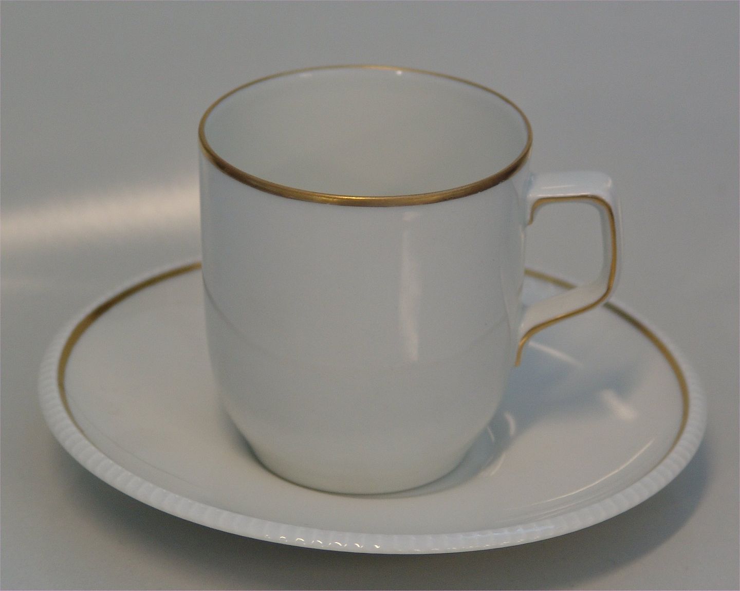 102 Kaffekop 7 x 6.7 cm og underkop 14 cm 1,25 dl (305) Vega B&G med smal guldbelægning på inderkanten . Form 674 er formgivet af Sigward Bernadotte. Denne form findes i hvidt, med bred guldkant (Gylden Sol), med grønt og guld (Perseus), med rødt og guld (Herkules) og beige og guld (Norma).