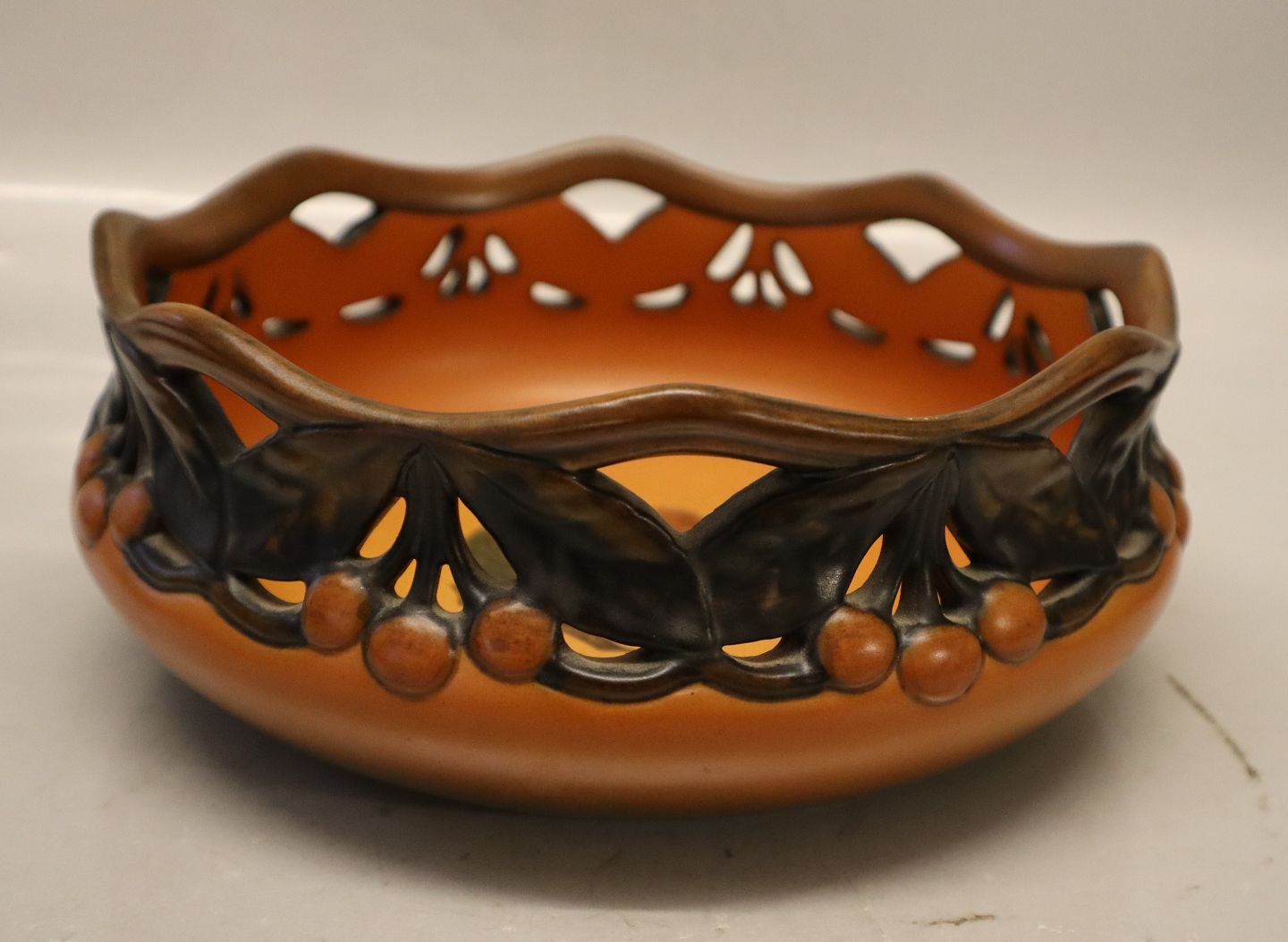 Beskrivelse: 716 Frugtfad med brudt kirsebærkant 10 x 24 cm Karen Hagen 1909 Keramik fra P. Ipsens Enke Kgl. Hof. Terracottafabrik 1843-1955 Dansk Skønvirke - Art nouveau