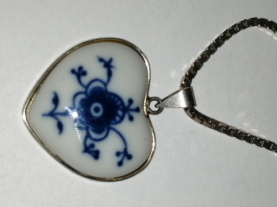 Silver mounted Blue fluted heart with silver chain Blue Fluted Danish Porcelain