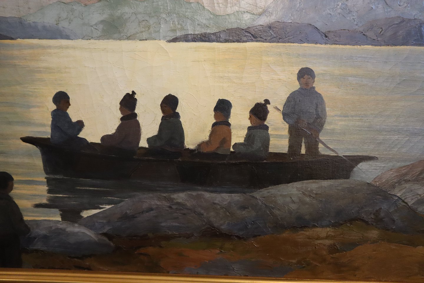 Painting: Uminaq - Woman's boat on the coast of Greenland. Oil on canvas 70 x 100 cm Sign. Emanuel A. Petersen.