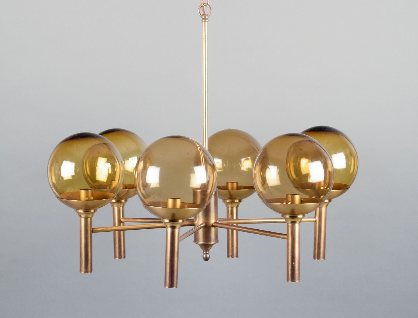 Sv. Mejlstrøm, Danish designer. Brass chandelier with six arms and dome-shaped shades made of amber-colored glass. Mid 20th century. In perfect condition. Dimensions: H 54.0 cm x D 66.0 cm.