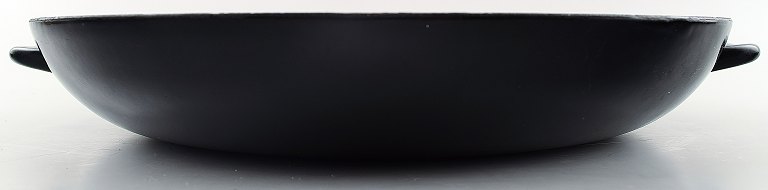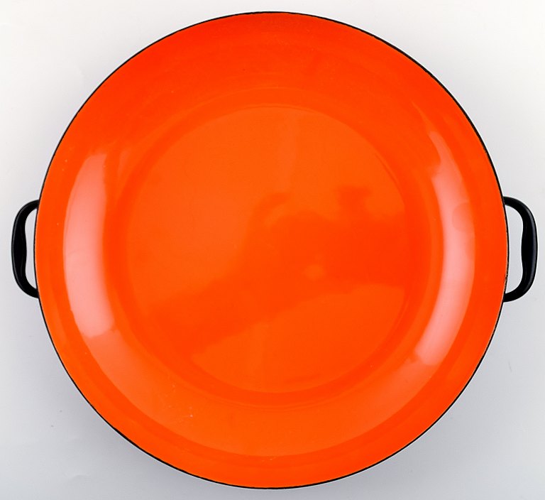 Orange Krenit fad af Herbert Krenchel. Sort metal og orange emalje. 1970'erne.