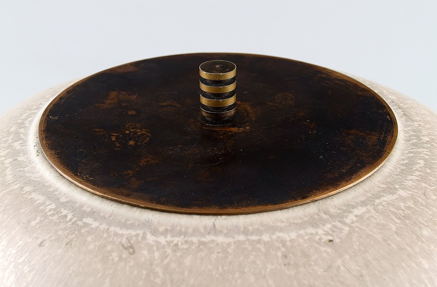 Stor Saxbo vase af stentøj med tilhørende bronzelåg, dekoreret med smuk æggeskalsglasur. Stemplet Saxbo. Måler 24 cm. x 22 cm. I perfekt stand.