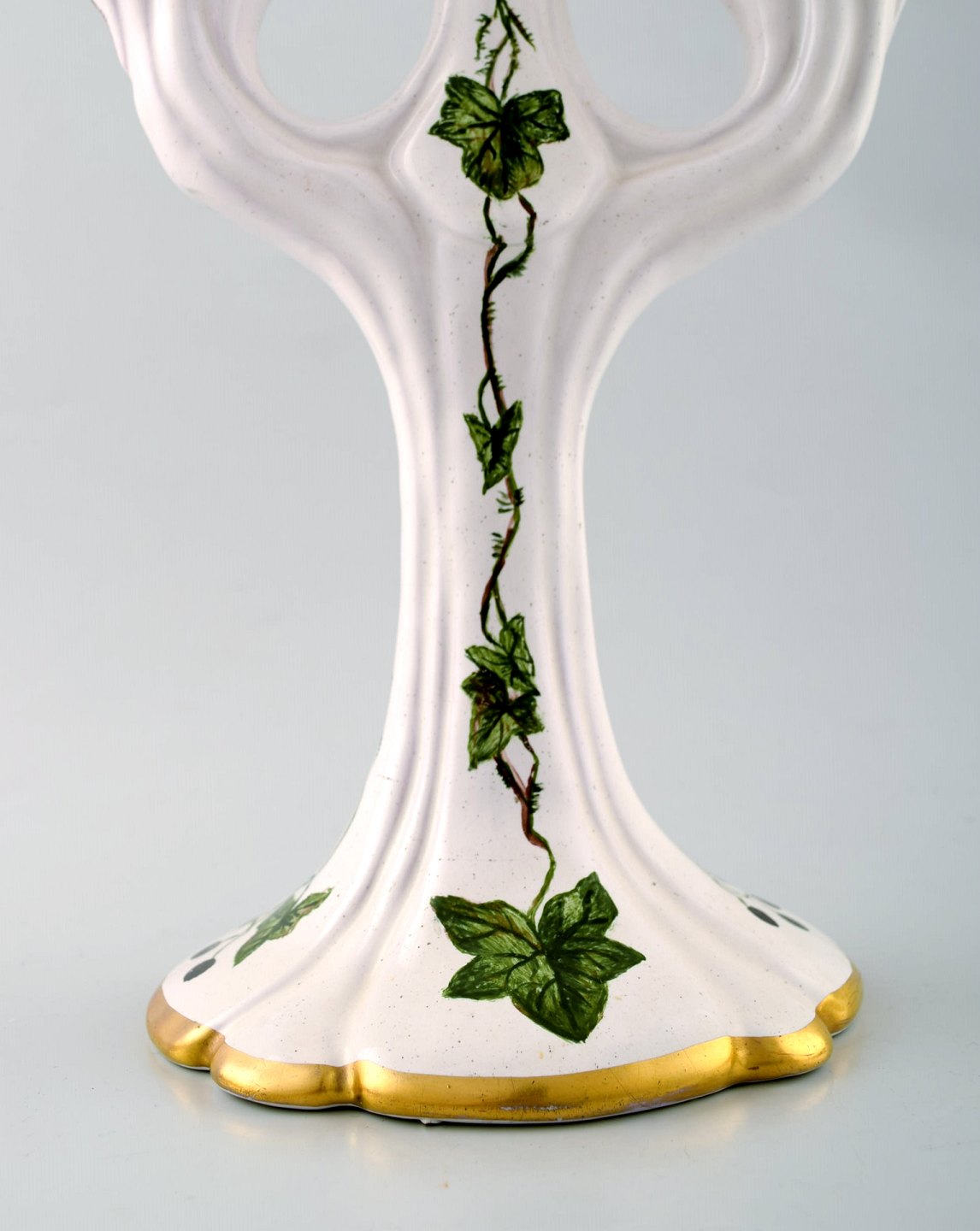 Signe Steffensen for Kähler: Et par kandelabre af keramik, dekoreret med glasur i hvide og grønne nuancer.