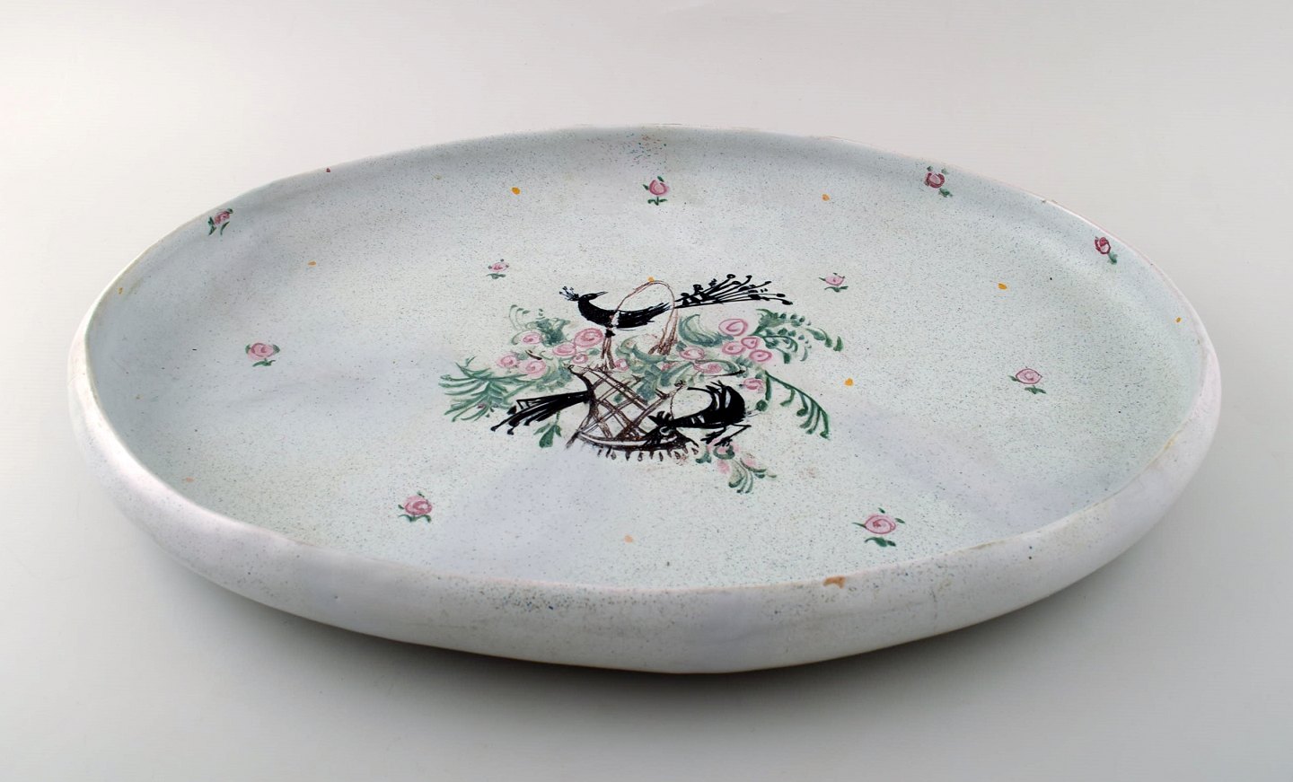 Bjørn Wiinblad : Sjældent og tidligt unika stort ovalt fad dekoreret med blomsterkurv og påfugle, Bjørn Wiinblad ca. 1945-50.