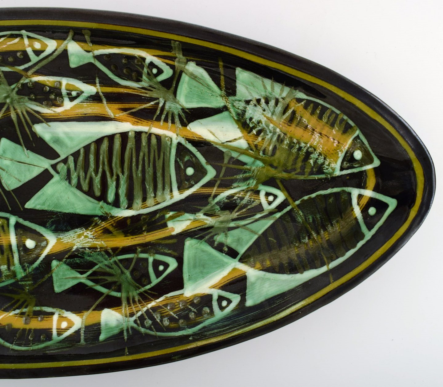 Dekoreret med fiskemotiv i grønt, sort og gult.
