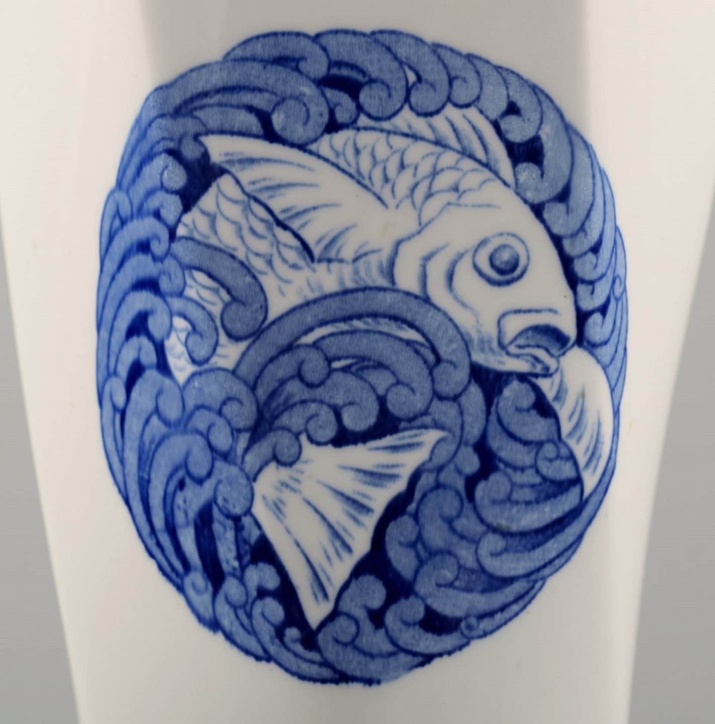 Rörstrand, stor vase i fajance dekoreret med fisk. Måler : 36 cm. x 16 cm. I perfekt stand. Stemplet. 1920´erne.