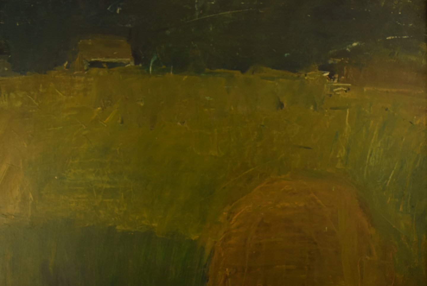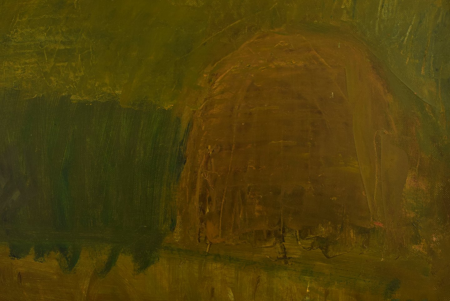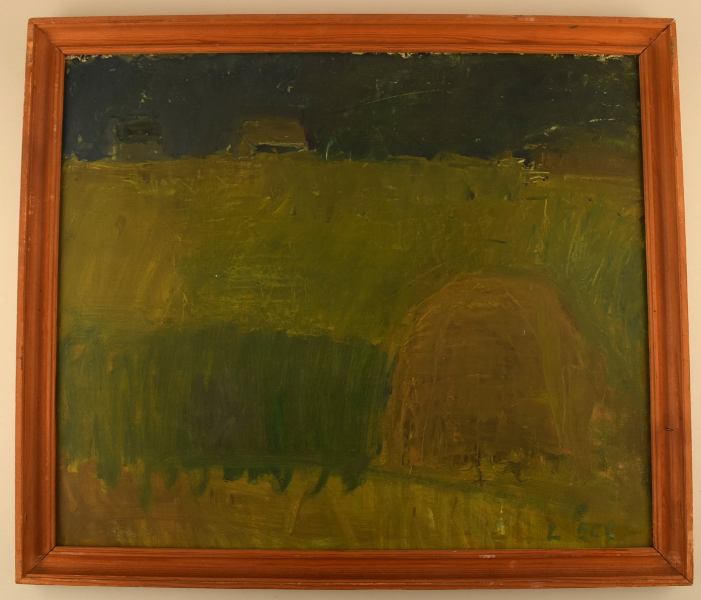 Norsk landskab med høstak og hus i baggrunden af Lili Ege (1913-2004). Olie på plade.