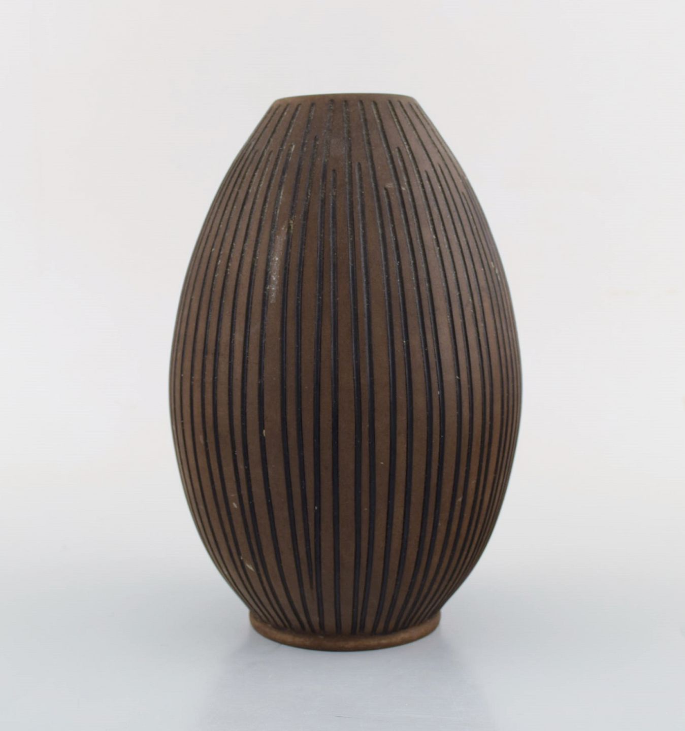 Helge Østerberg, Danmark. Vase i glaseret keramik med riflet korpus. Smuk glasur i brune nuancer. 1960'erne. Signeret Ø, Denmark. Måler: 19 x 14 cm. I flot stand.