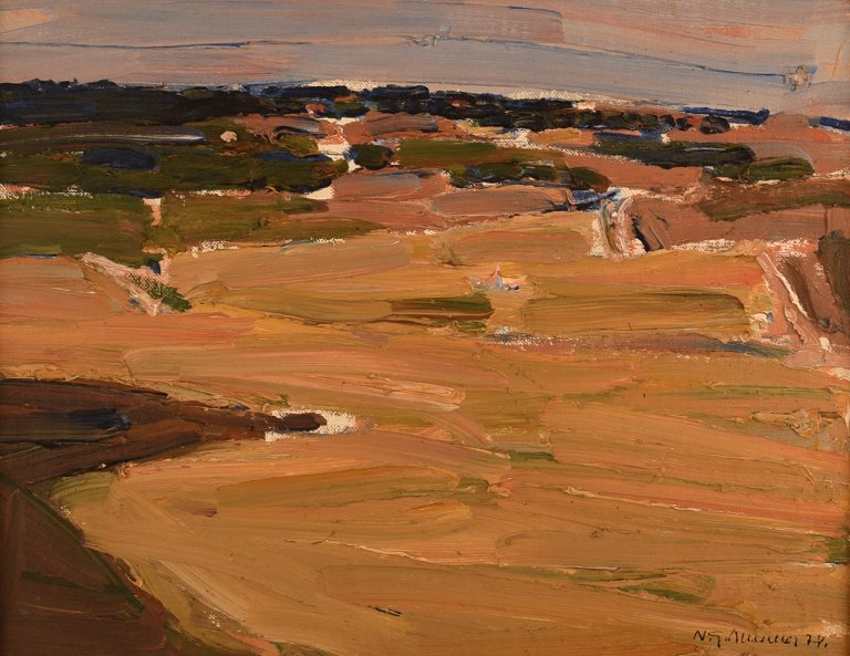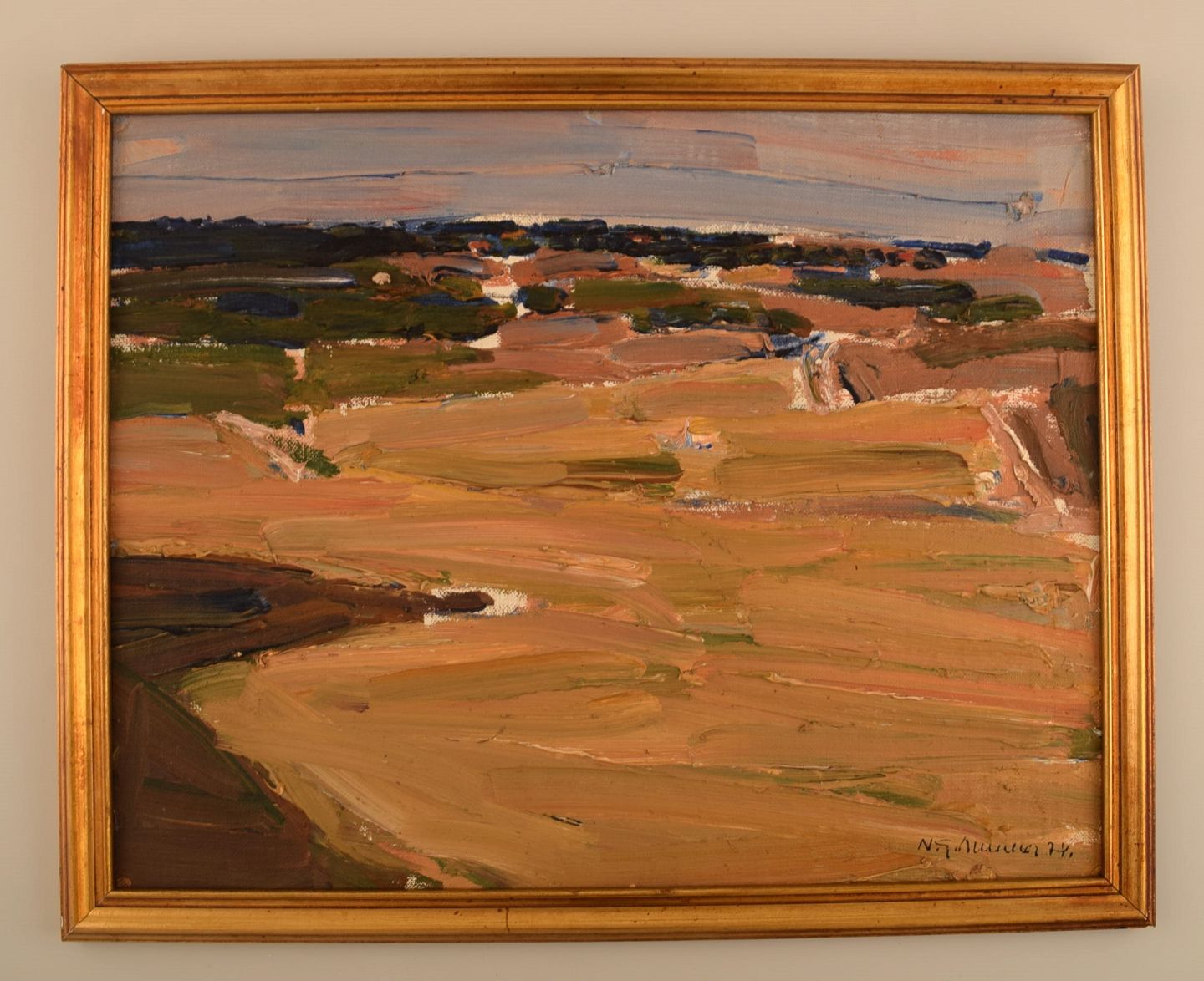 Nils-Göran Brunner (1923-1986). Svensk kunstmaler. Olie på plade. Modernistisk landskab. Dateret 1974.