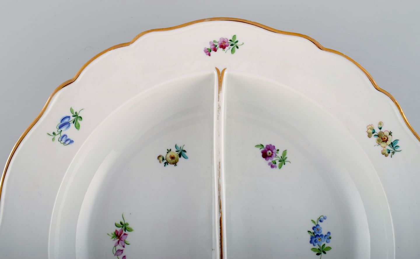 Large round Meissen bowl with room divider in hand-painted porcelain with flowers and gold decoration. Late 19th century. Measures: 34 x 6.5 cm. In excellent condition. Stamped. 2nd factory quality.