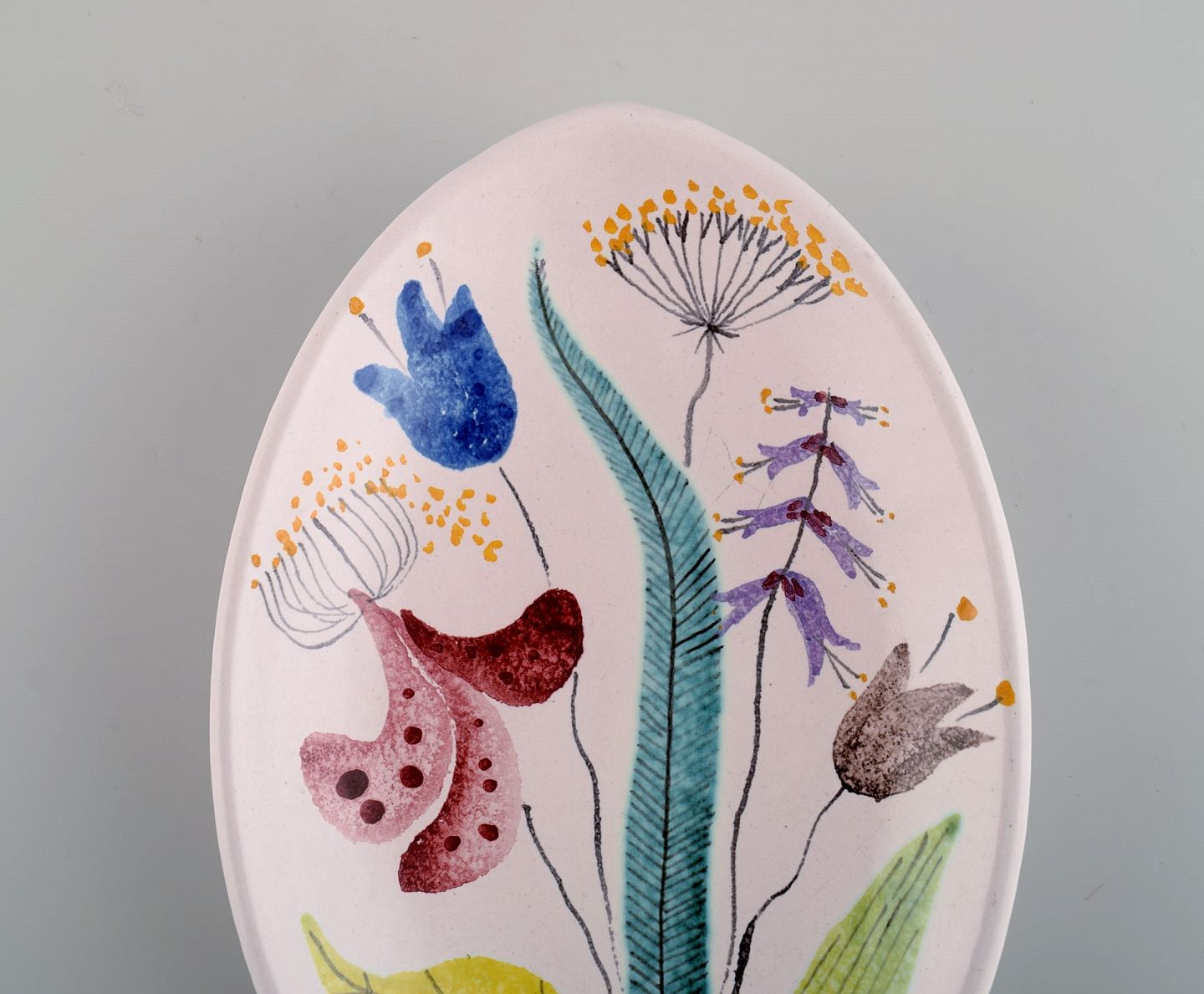 Stig Lindberg for Gustavsberg Studio Hand. Aflang skål i glaseret fajance med håndmalede blomster. Ca. 1950. Måler: 21 x 12 x 5 cm. I flot stand. Signeret.