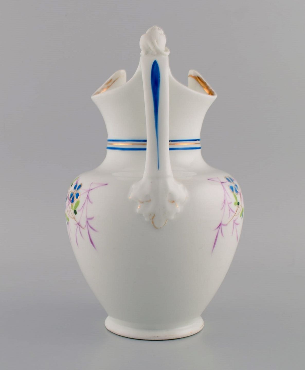 Antique Bing & Grøndahl chocolate jug in porcelain modeled with a lion on the handle. Hand-painted flowers and gold decoration. 1870s.
