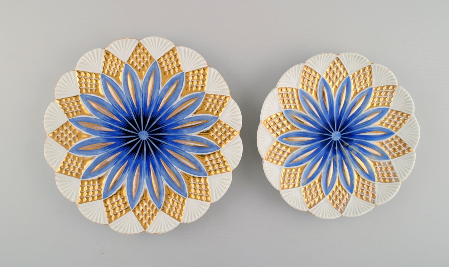 To antikke Meissen tallerkener i håndmalet porcelæn. Blå blomster og gulddekoration. Tidligt 1900-tallet. Største diameter: 21,5 cm. I flot stand. Stemplet. 1. Sortering.