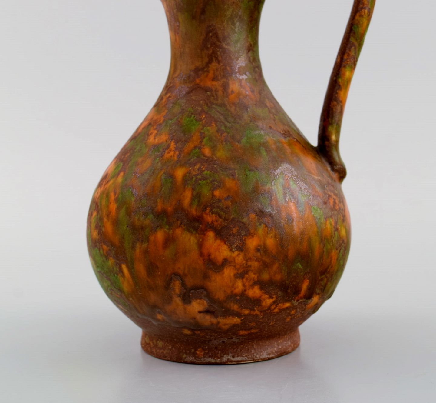 Europæisk studiokeramiker. Unika kande i glaseret stentøj. Smuk glasur i orange nuancer. 1960/70'erne. Måler: 21 x 14 cm. I flot stand. Signeret.