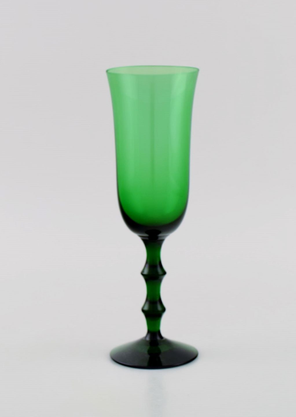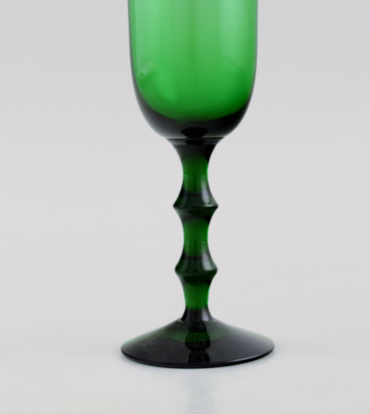 Simon Gate for Orrefors. Tre Salut champagneglas i grønt mundblæst kunstglas. Svensk design, 1920/30'erne.