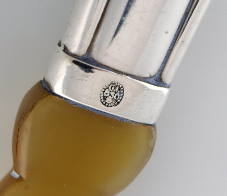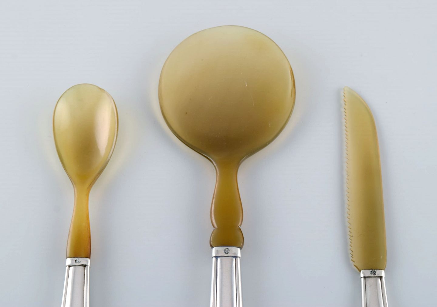 Tre tidlige dele Georg Jensen Liljekonval i sølv (830) og horn. Dateret 1915-1930.