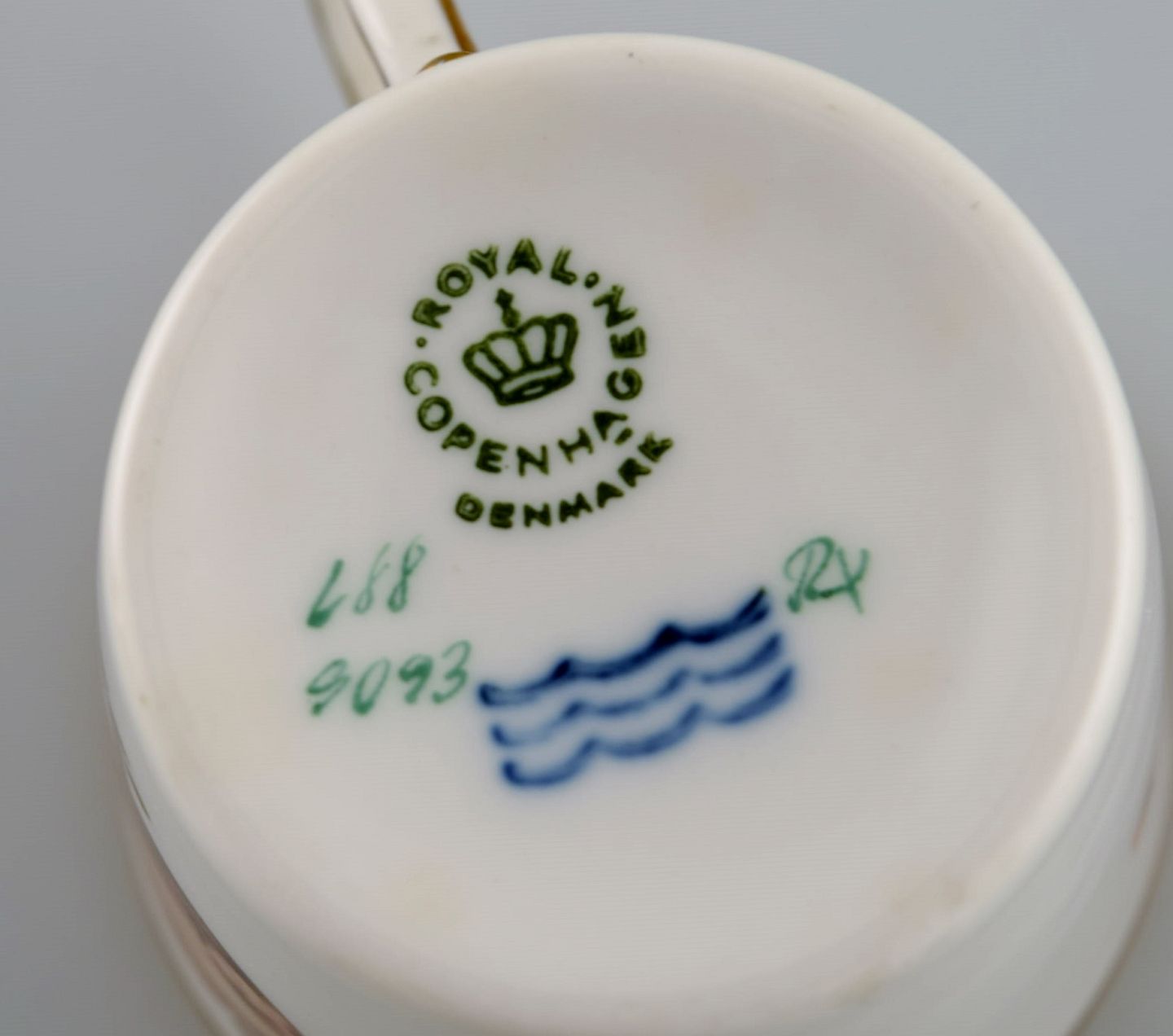 12 Royal Copenhagen Brown Rose mocha / coffee cups with saucers in hand-painted porcelain with flowers and gold edge. Dated 1968.
