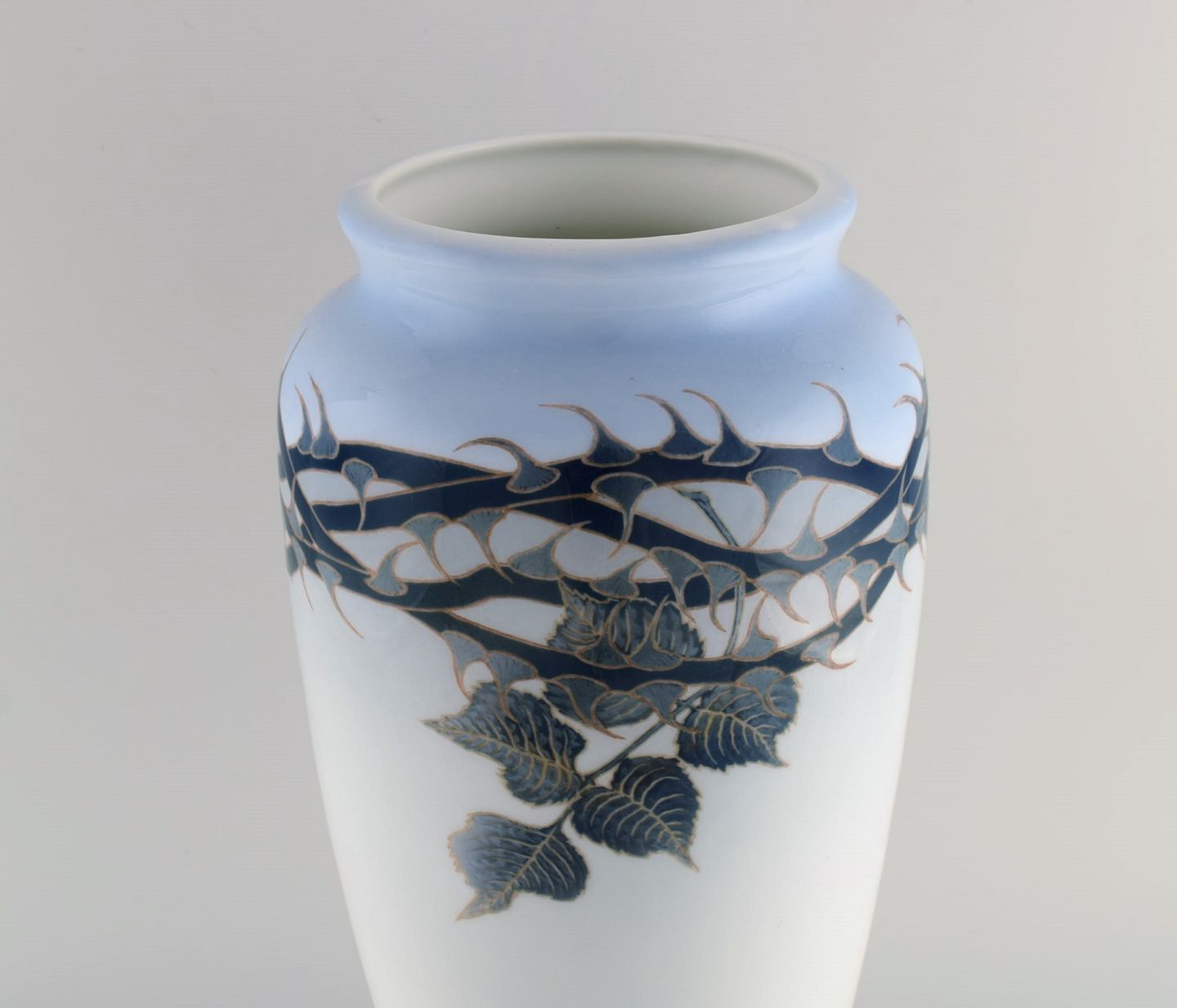 Bertha Nathanielsen for Royal Copenhagen. Stor unika art nouveau vase i håndmalet porcelæn. Hvid rose med torne. Dateret 1929.