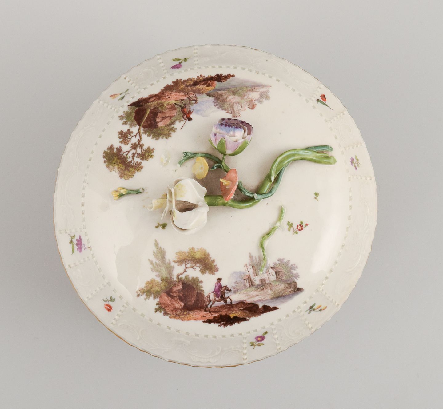 Louisbourg, Tyskland. 1700 tals stor sukkerskål, håndmalet med landskabsscenerier, låg med blomster i relief.