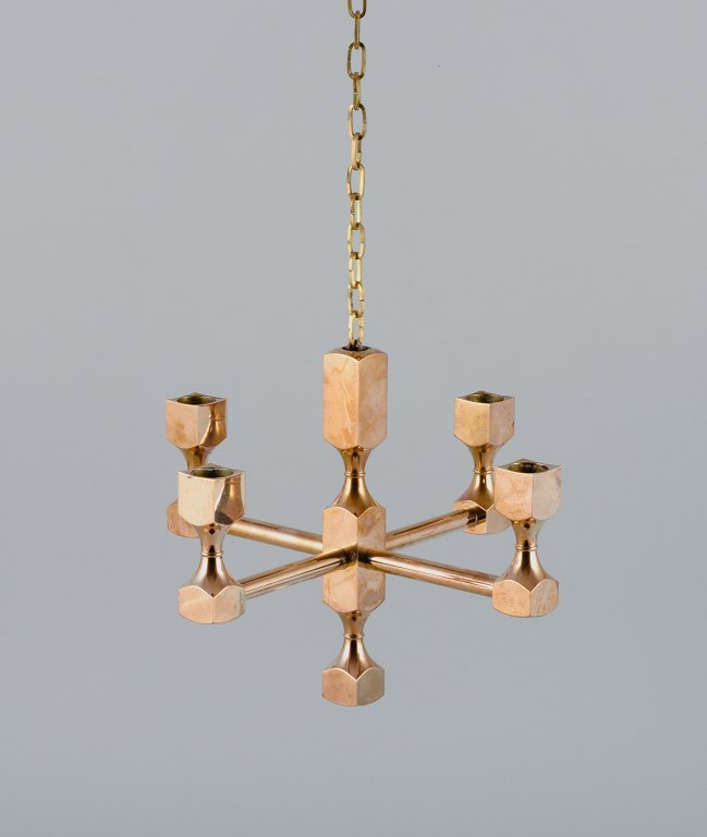 Gusum Metall, Sverige, lysekrone i massiv messing til fire stearinlys. Svensk design. Ca. 1970’erne. Signeret i top. Perfekt stand. Mål: H 20,0 (eksklusiv kæde) D 25,0 cm. Kæde måler ca. 118 cm.