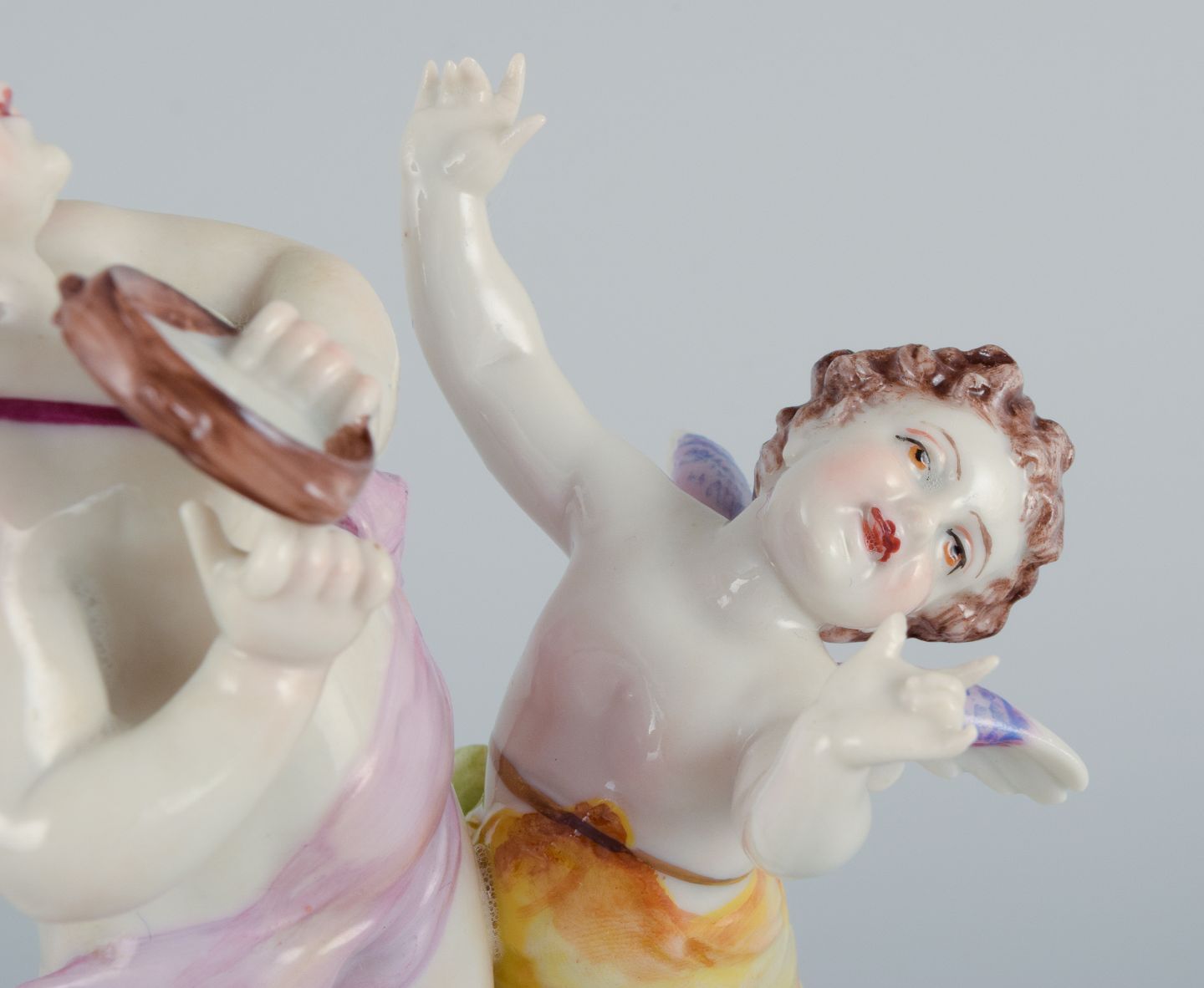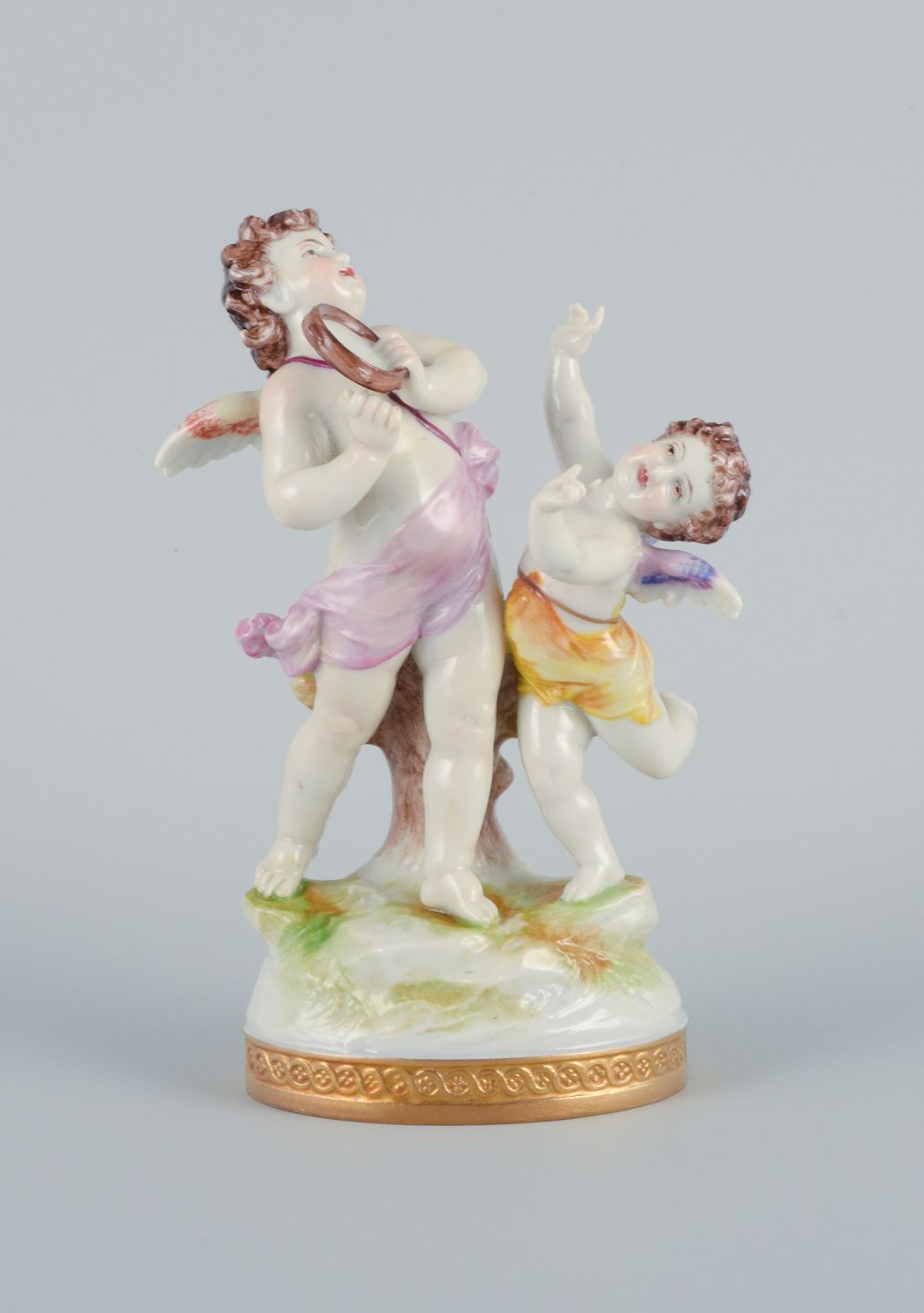 Rudolstadt Volkstedt, Tyskland, porcelænsfigur med to puttier i leg. Signeret. Håndmalet, overglasur. Tidligt 1900-tallet. I flot stand. Mål: H 15,0 x B 10,0 cm.