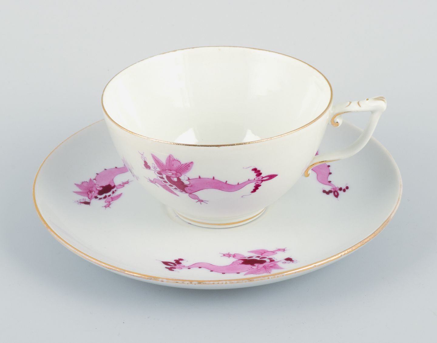 Meissen, Rich Court Dragon, a five-person purple tea service with gold decoration. Consisting of five pairs of teacups and a cream jug.