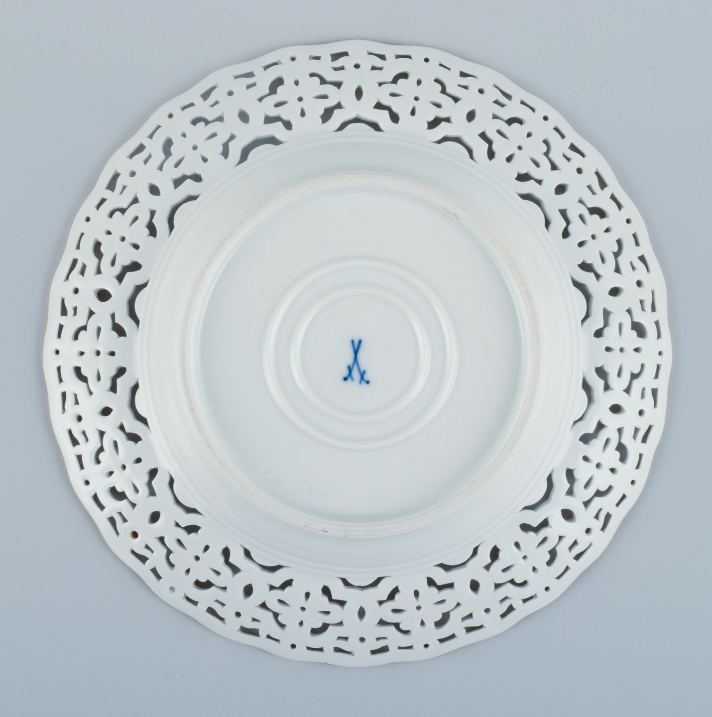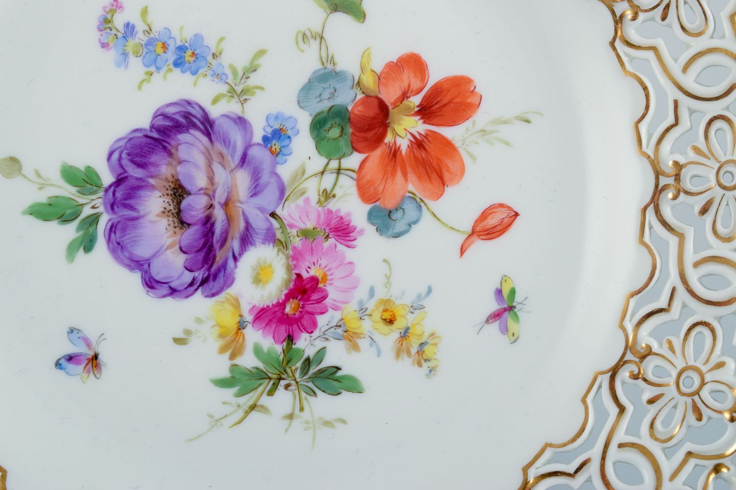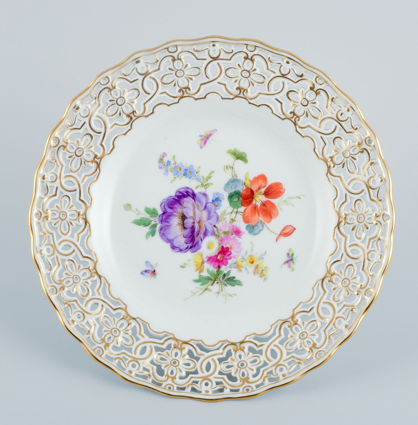 Meissen, Germany, openwork plate hand painted with flowers and butterflies.
