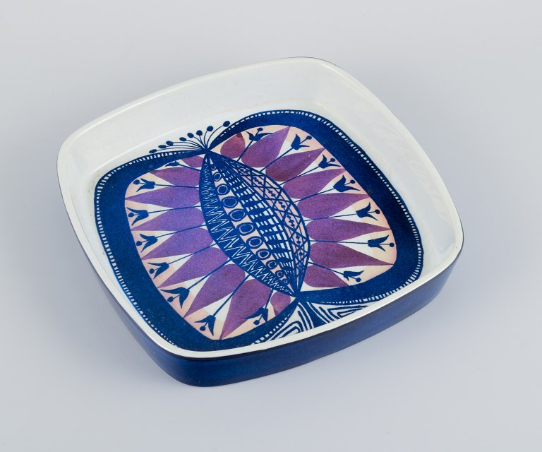 Royal Copenhagen, faience bowl with motif of peacock in modernist style. 1970s. Model number: 168/2884. Marked. Perfect condition. Dimensions: D 22.5 cm x H 4.0 cm.