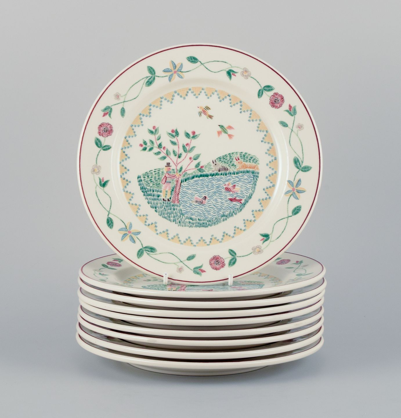 Villeroy & Boch, Luxembourg, a set of nine "American Sampler" porcelain plates decorated with landscape, ducks, fish, and sheeps. 1983-1989. Marked. In perfect condition. Dimensions: D 20.8 cm.
