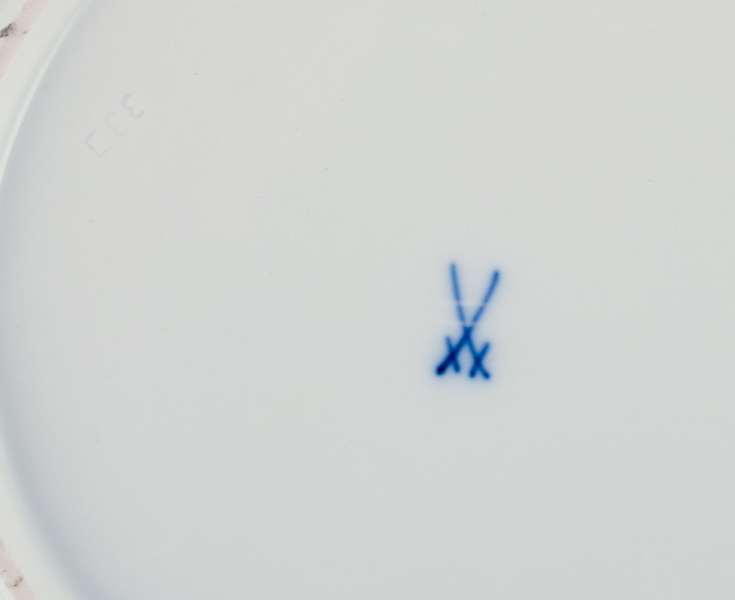 Meissen, et sæt på seks dybe porcelænstallerkner håndmalet med blomstermotiver i purpur. Gulddekoration på kant. Ca. 1930’erne. I perfekt stand. Tredje sortering. Stemplet. Mål: D 24,2 cm. x H 3,5 cm.