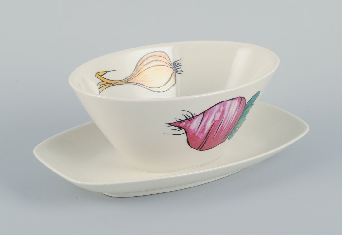 Villeroy & Boch, Luxembourg, three pieces of "Primabella", including a large bowl, a sauce boat, and a platter in stoneware featuring various vegetable motifs.