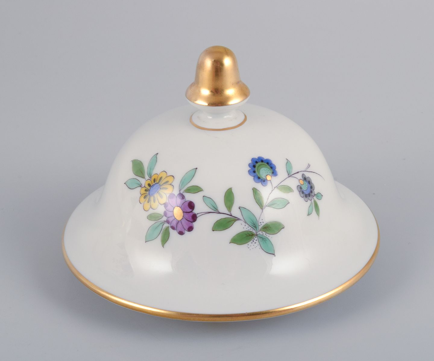 Meissen, Tyskland, stor lågkrukke i porcelæn håndmalet med eksotisk fugl og blomstermotiver.