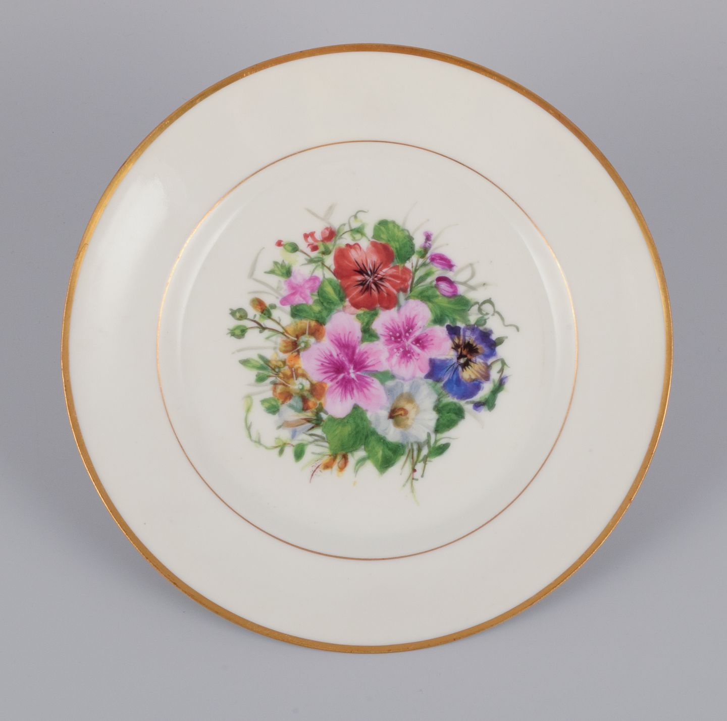 Bing & Grøndahl, Denmark. A set of five porcelain plates hand-painted with various polychrome flower motifs and gold rim.