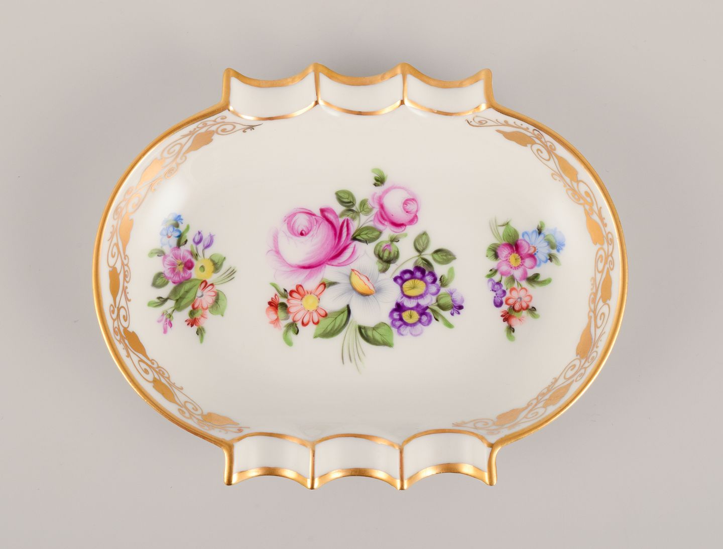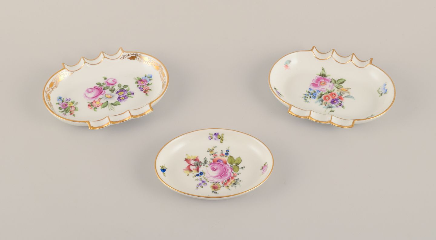 Herend, Hungary. Three small oval bowls hand-painted with polychrome flower motifs and gold decoration. Mid-20th century. Marked. In perfect condition. Large: Length 13.7 cm. Small: Length 12.0 cm.