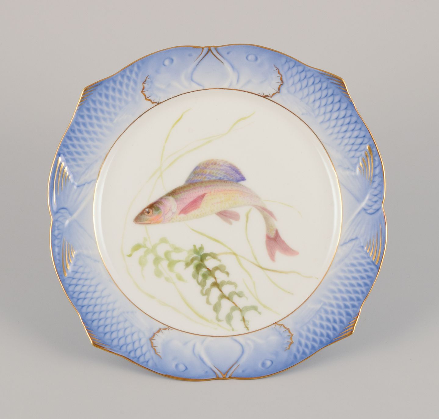 Royal Copenhagen Fauna Danica fisketallerken. Håndmalet fiskemotiv og gulddekoration.