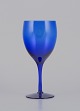 Et sæt på seks rødvinsglas i blåt kunstglas. Håndlavet.
