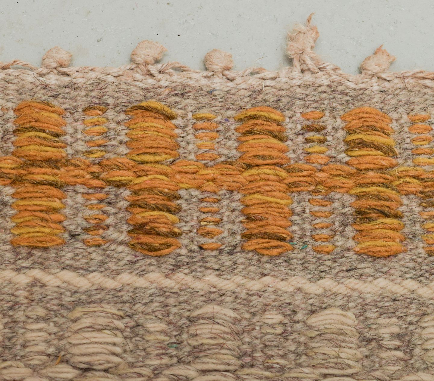 Svensk tekstildesigner. Håndvævet tæppe i ren uld. Geometriske felter. Gule, grå og hvide farver. Sent 1900-tallet. I flot stand. Kan med fordel renses. Mål: 200 cm. x 127 cm.