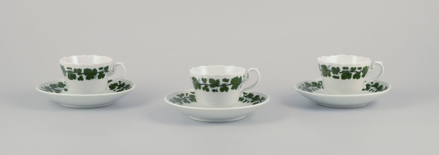 Meissen, Germany, Green Ivy Vine, three coffee cups with saucers. Hand-painted.