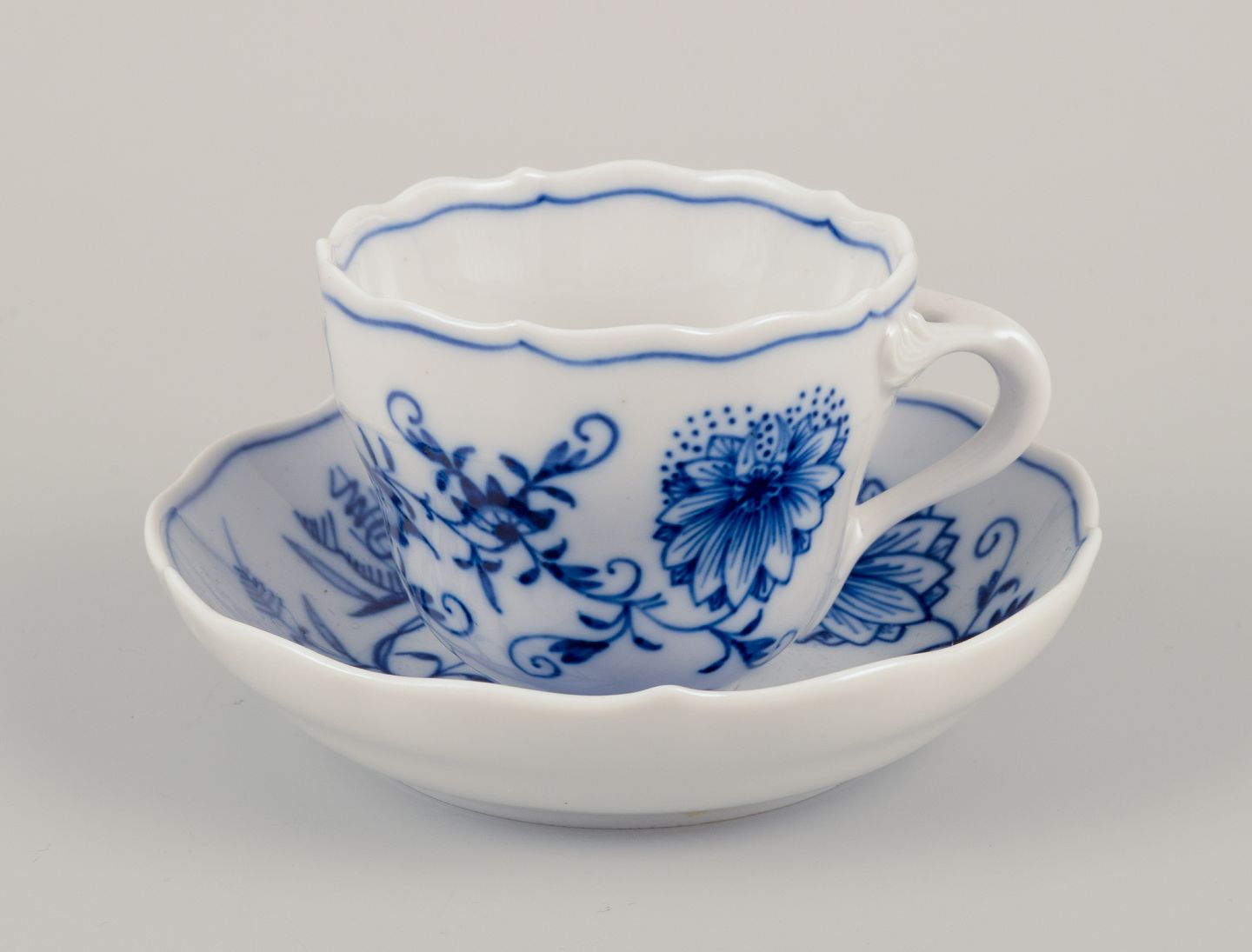 A set of four Blue Onion pattern demitasse cups with saucers.