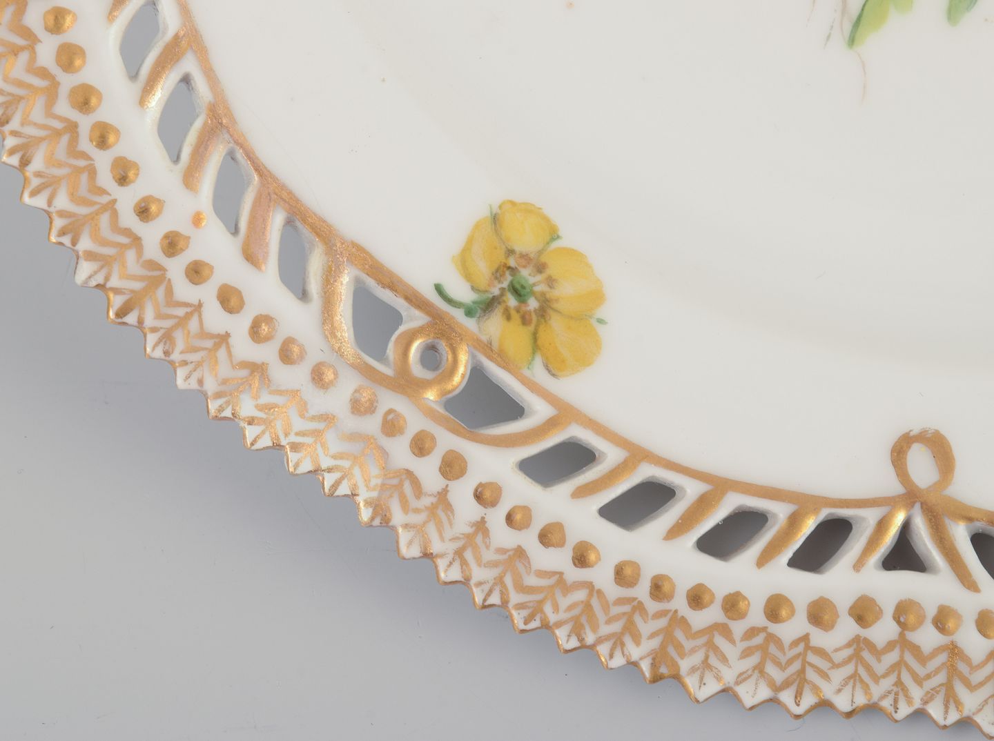 Royal Copenhagen Flora Danica, hjemmedekoreret gennembrudt frokosttallerken. Guldkant. Håndmalet. Tidligt 1900-tallet. Stemplet. Perfekt stand. Anden sortering. Mål: D 22,0 cm.