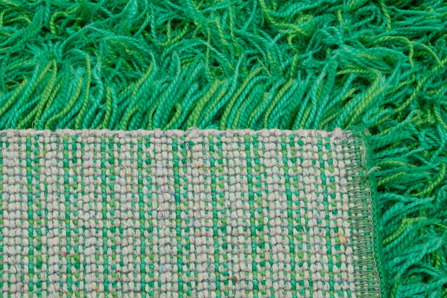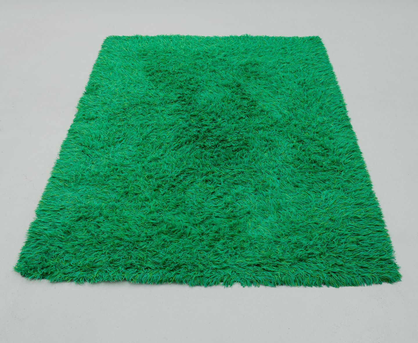 Skandinavisk tekstildesigner. Ryatæppe i ren bomuld. Grønne toner. 1970’erne. Perfekt stand. Mål: 204 cm. x 170 cm.
