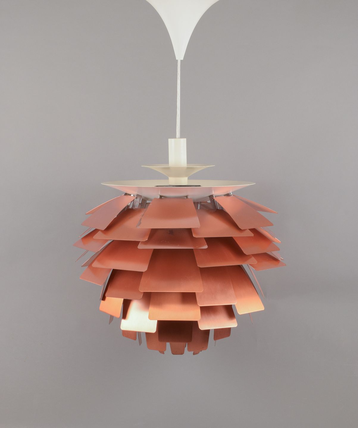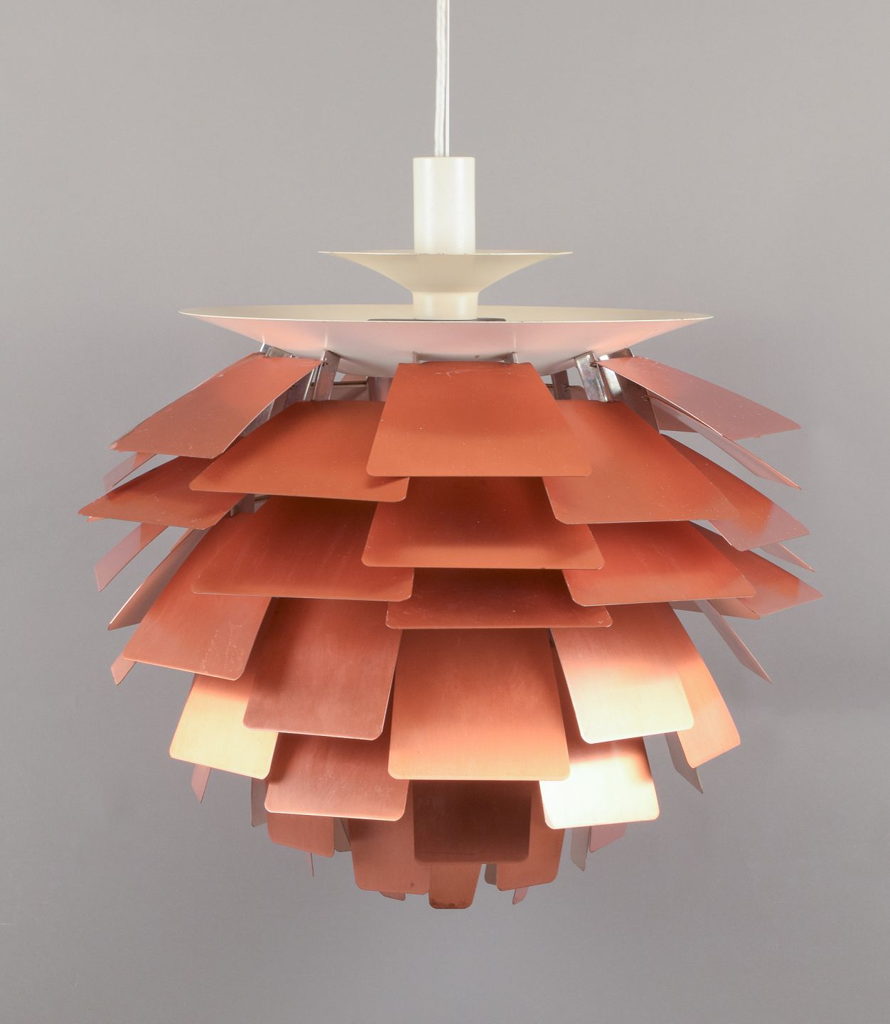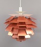 Poul Henningsen for Louis Poulsen. "Kogle" (PH Artichoke) pendant. Upper shade in matte white metal, blades in lacquered copper, suspension with integrated steel line. 72 blades.